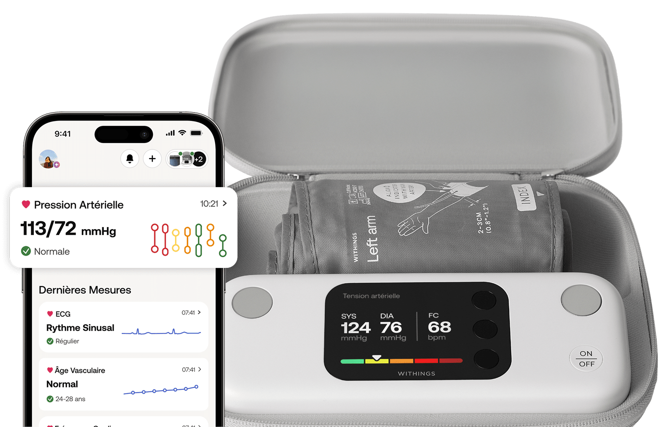 Si vous recherchez un appareil de suivi médical ou un appareil santé connecté, vous êtes au bon endroit !Nos tensiomètres sont des objets connectés de précision médicale développés avec des cardiologues, qui permettent grâce à la connexion Wi-Fi et connexion Bluetooth de suivre et gérer votre santé et celle de toute votre famille. Un tensiomètre connecté permet de mesurer la tension de manière précise grâce à des mesures de pression systolique et diastolique. Pour une meilleure santé cardiovasculaire, nos tensiomètres sans fil enregistrent la pression artérielle et la fréquence cardiaque en quelques secondes. En tant que tensiomètres connectés, ils se synchronisent automatiquement avec l’application gratuite Withings. Le mode d’emploi et manuel d'utilisation de nos tensiomètres sans fil sont simples : pour lancer la mesure, il suffit de placer le tensiomètre au bras, puis d’appuyer sur un seul bouton. Afin de mieux maîtriser l'hypertension et éviter le syndrome de la blouse blanche, les tensiomètres sans fil BPM Vision, BPM Core et BPM Connect vous proposent une taille du brassard qui s'adapte à un maximum utilisateur·rice·s et une compréhension instantanée de vos mesures grâce à un code couleur. L’application gratuite Withings se charge d’afficher et clarifier les résultats, et vous permet de les partager facilement avec un médecin. Bien que des tensiomètres au poignet soient disponibles sur le marché, des études, notamment celles de l'American Heart Association, suggèrent qu'ils n'offrent pas toujours le même niveau de précision que les tensiomètres au bras. C'est pourquoi Withings privilégie les solutions de tensiomètre au bras cliniquement validées afin de garantir précision et fiabilité pour une utilisation à domicile. Le tensiomètre connecté BPM Core est pourvu d’un stéthoscope électronique qui permet de détecter les valvulopathies les plus répandues comme le rétrécissement aortique (sténose aortique) ou l’insuffisance mitrale. Également équipé d’un électrocardiogramme capable de détecter la fibrillation atriale, une anomalie fréquente de l’activité électrique du cœur, BPM Core est notre tensiomètre connecté le plus avancé. Chez Withings, nous prenons très au sérieux la sécurité et la confidentialité des données de santé de nos utilisateurs. Nous garantissons la sécurité de vos données médicales personnelles lorsque vous utilisez nos appareils de santé connectés. De plus, notre service client est toujours disponible pour vous aider à tirer le meilleur parti de votre tensiomètre de bras connecté. Note : BPM Core n'est disponible qu'en Europe pour le moment.